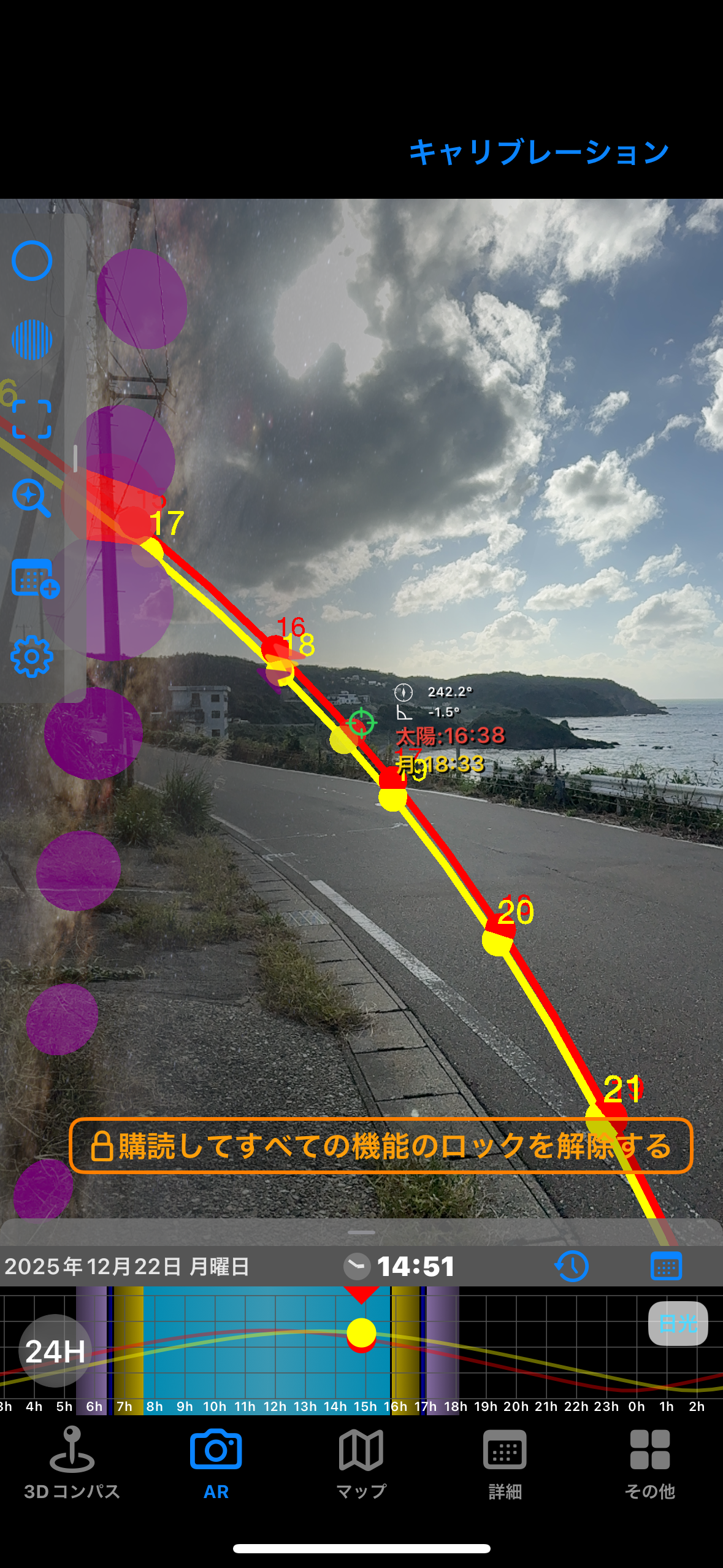 夕日が沈む位置が日付指定で確認できる!
